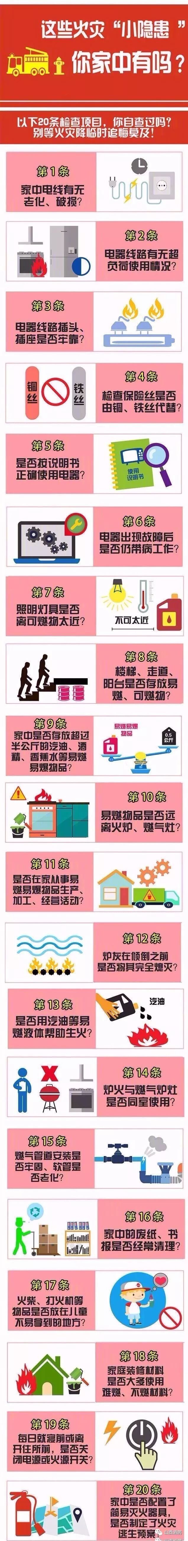 2019年的日历越来越薄 不管小伙伴们愿不愿意 201x开头的年份就要结束了 眼看元旦马上就到了 紧接着就是春节 这么重要的团圆时节 如果没有“安全”作保障 想想都觉得可怕! 你想…… 你细想…… 所以 放假前 给家里来一个“隐患”大排查 非常有必要! 这些检查项目主要是针对家庭中经常出现的消防安全问题,建议定期对照这些对自己的爱家进行自查哦! 还等着什么 赶快行动起来吧! 愿每一个家庭都平安快乐!